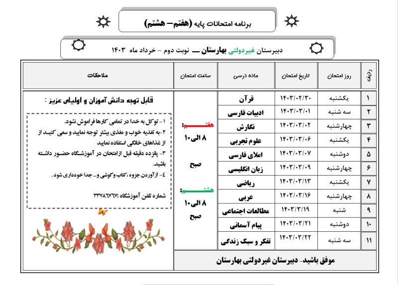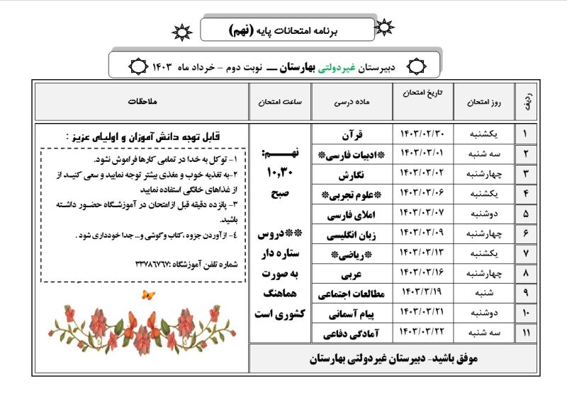 برنامه امتحانات نوبت دوم۱۴۰۳