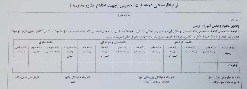 فرم نظر خواهی و اولویت بندی هدایت تحصیلی دانش آموزان پایه نهم