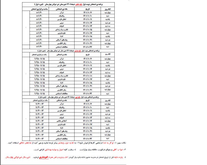 برنامه امتحانات نوبت اول دبیرستان بهارستان
