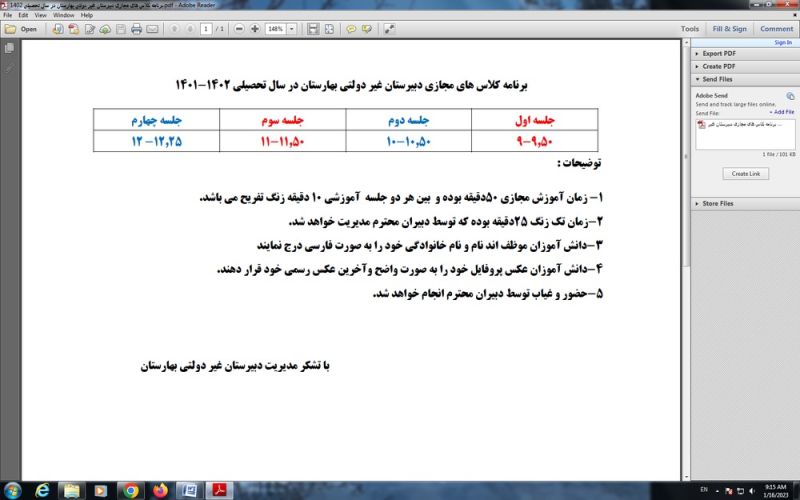 برنامه کلاس های مجازی دبیرستان غیر دولتی بهارستان