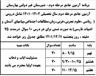 دومین مرحله آزمون جامع دبیرستان پسرانه غیر دولتی بهارستان ناحیه ۲ زنجان در تاریخ پنجشنبه 11 اسفند ماه ۱۴۰۱ برگزار خواهد شد.