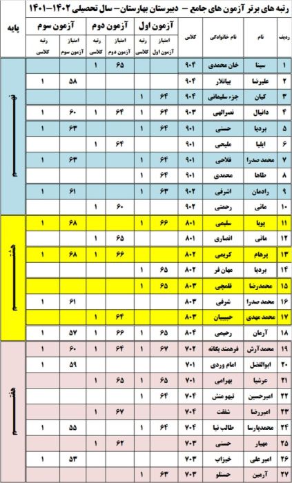 نفرات برتر آزمون سه مرحله ای جامع مختص دبیرستان غیر دولتی بهارستان